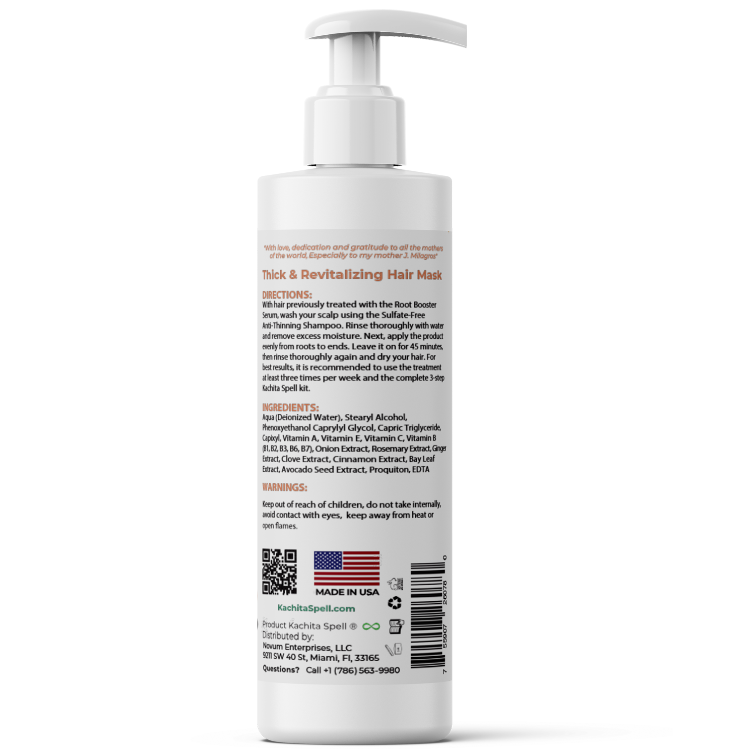 Kachita Spell Growth Hair Mask is a nourishing hair treatment designed to support healthier-looking hair while providing deep moisture, softness, and shine. Formulated with Biotin and a carefully selected botanical blend of Onion, Rosemary, Ginger, Cinnamon, and Bay Leaf, this mask helps improve the appearance of volume and hair strength.
